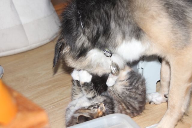 wennen dat ik niets hoor. Hond Britta begint de kittens steeds leuker te